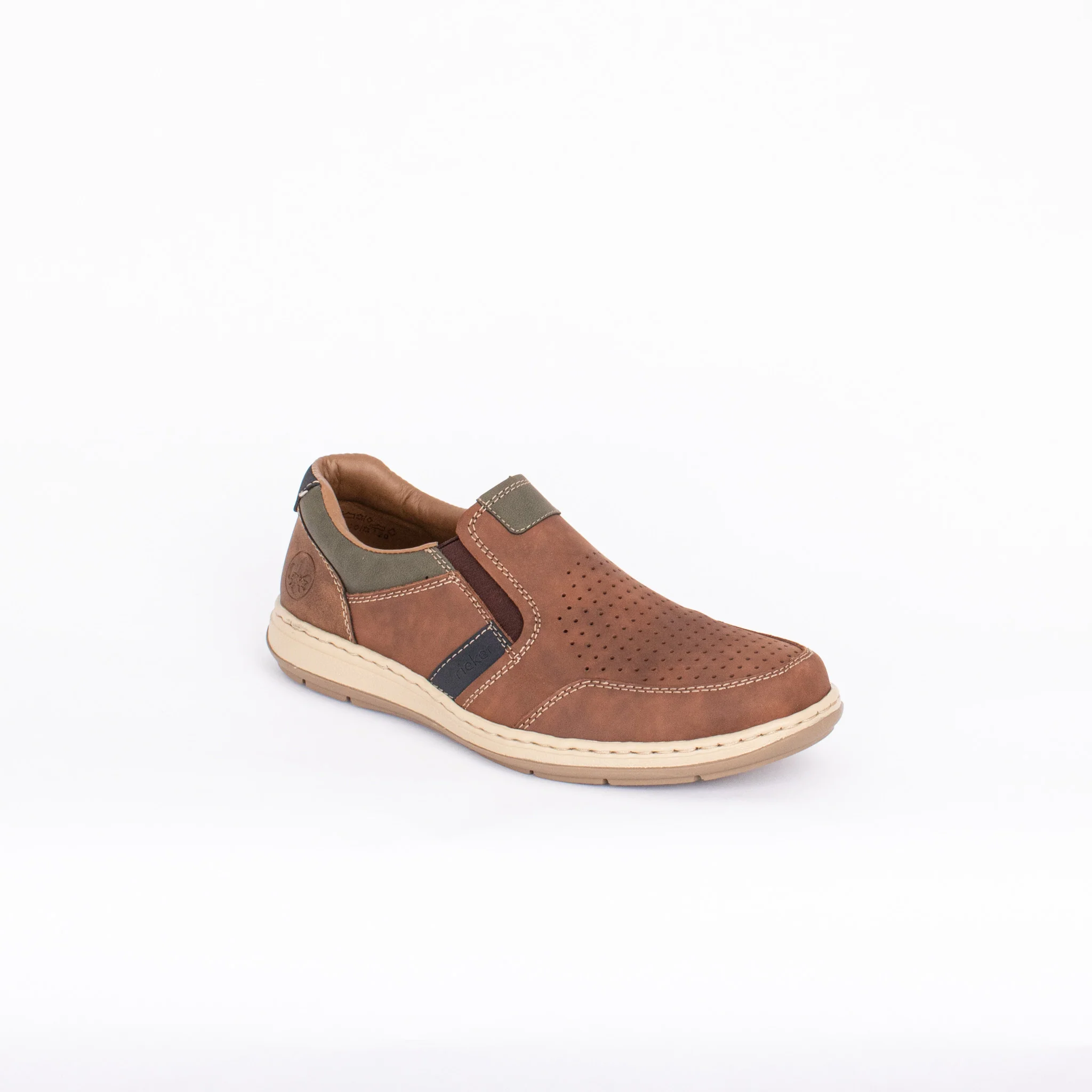 18266-24 : Ces mocassins pour hommes de Rieker ont un look sportif et élégant. La tige en cuir est perforée au niveau du cou-de-pied et décorée d'éléments verts et bleu foncé.