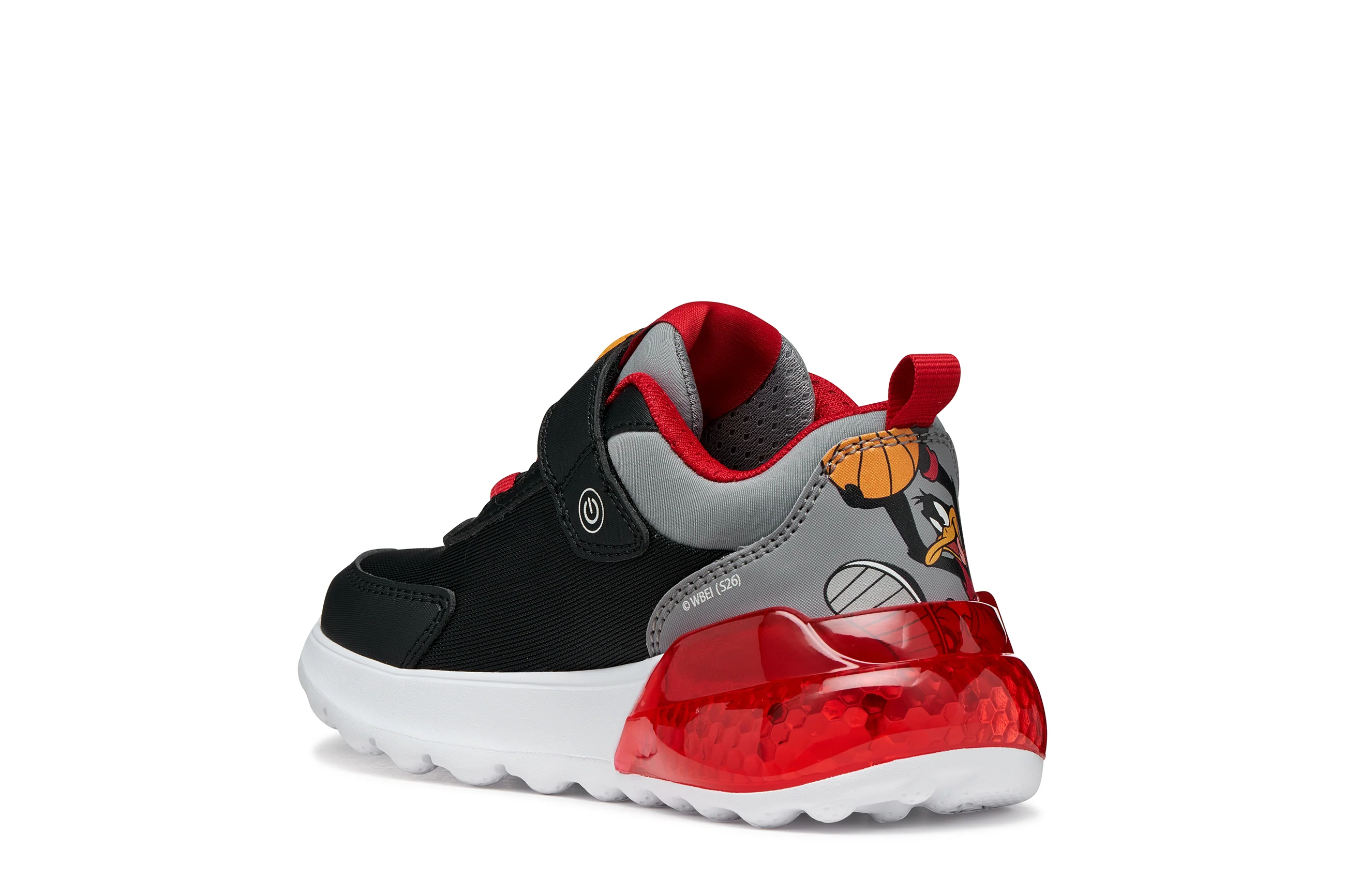Espadrille junior au style actif, issue de la collaboration entre Geox et Warner Bros. Dans cette version noire et rouge, elle dynamise chaque tenue grâce aux lumières intégrées à la semelle extérieure, qui se reflètent au sol en créant un effet kaléidoscopique unique. Confectionnée en textile et en matière synthétique effet cuir embossé, elle allie confort et résistance. Le modèle est agrémenté d’empiècements et de graphismes dédiés au personnage des Looney Tunes, Daffy Duck. Une chaussure ludique et tendance, parfaite pour l’école et les loisirs.
